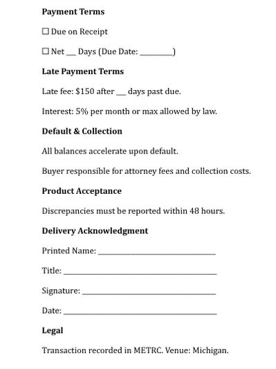 Curaleaf has demonstrated that if afforded the opportunity, MSO's will do anything they can to get out of an unfavorable contact. This includes taking disputes to Federal court to argue the contract is unenforceable due to marijuana's Federal status. To offer some protection against this, it is advisable to include a statement that the invoice states "exclusive jurisdiction in Michigan state courts"